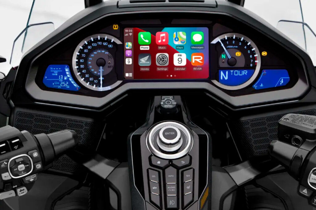 A GL 1800 Gold Wing é a primeira a oferecer conexão com o Apple CarPlay. Agora, você pode conectar o seu iPhone ao painel da motocicleta, utilizando aplicativos de navegação, música, agenda e tempo, entre outros. Tudo isso em uma tela TFT de 7”.
